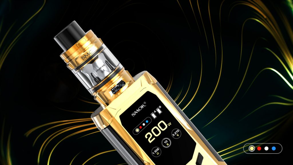 - R-Kiss">astrogrowshop.dlds.cl/vaporizadores/12303-smok-vaporizador-r-kiss-kit-red.html">R-Kiss de Smok:">smoktech.com/">Smok: Es moderno y minimalista. Posee un display claro, doble batería intercambiable tipo 18650, 200W de potencia máxima. Además, en esta versión, incluye un atomizador TFV Mini V2 con 2ml de capacidad, flujo de aire ajustable y sistema de llenado de líquido superior.