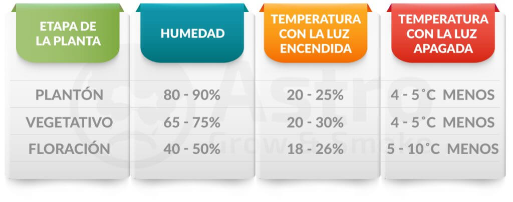 Valores óptimos de la humedad y temperatura según su etapa