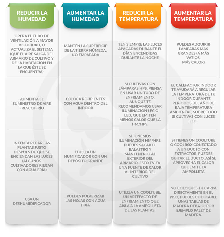 Existen algunos métodos para poder tener el control de la humedad y la temperatura a niveles aceptables, incluso óptimos. Algunos son más sofisticados que otros, variando en su costo y efectividad.
